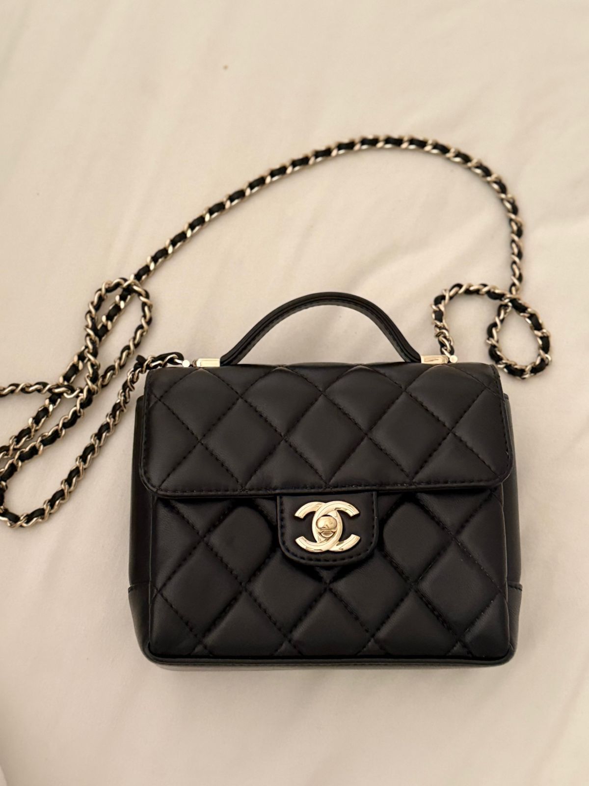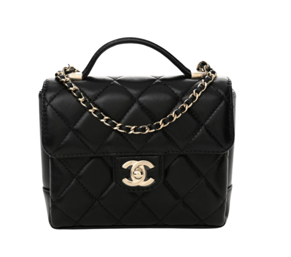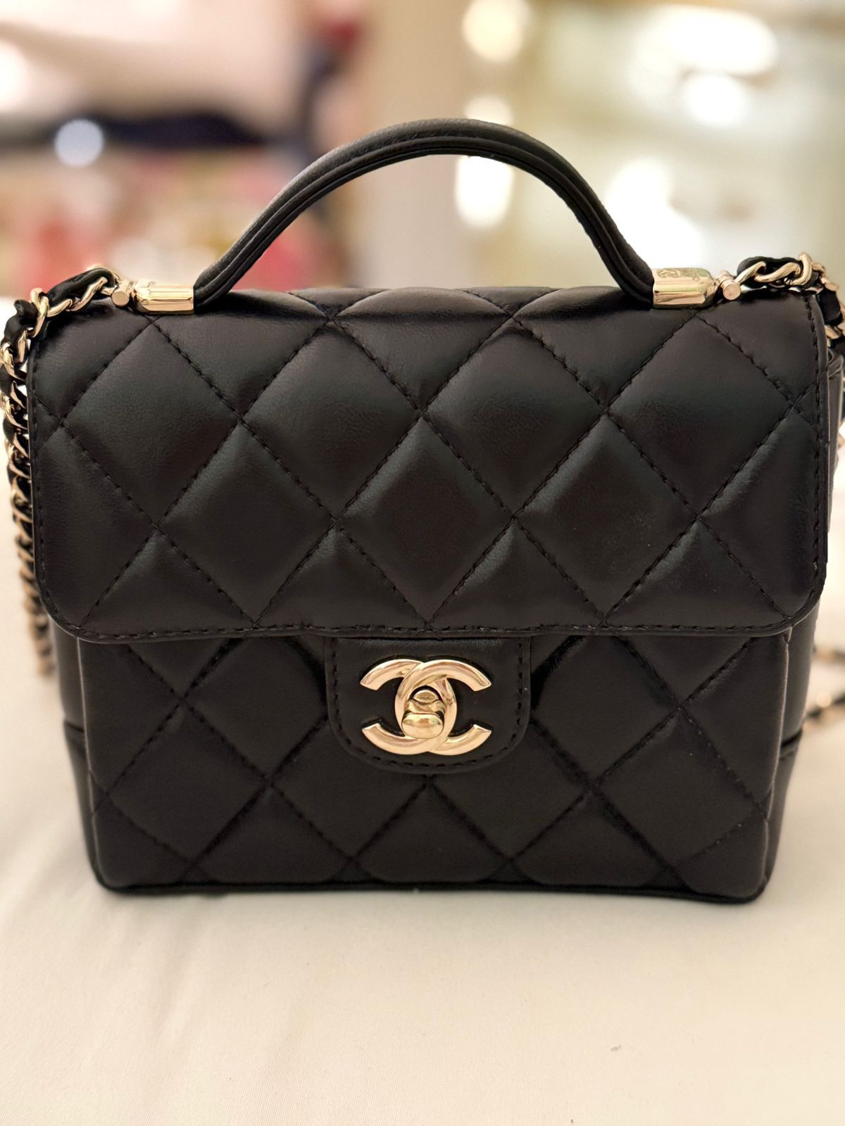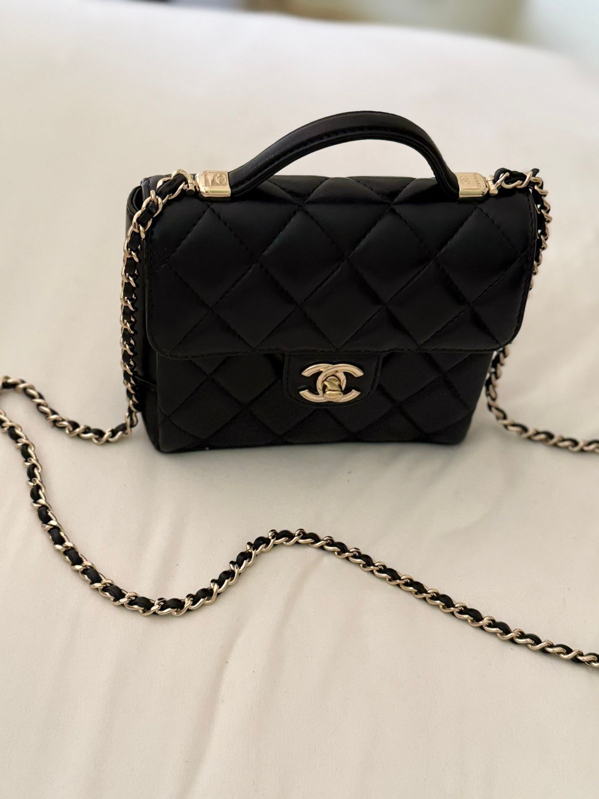 CHANEL Mini Lambskin Quilted Top Handle Flap in Black Condition: Excellent Purchase Price: 23,000 QARAccessories: Complete Batra offers authenticity verification and international shipping. Please contact us before purchasing to ensure a safe transaction.