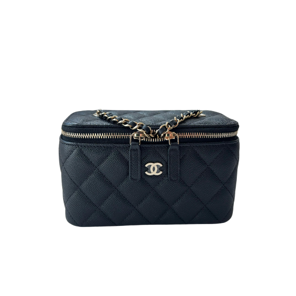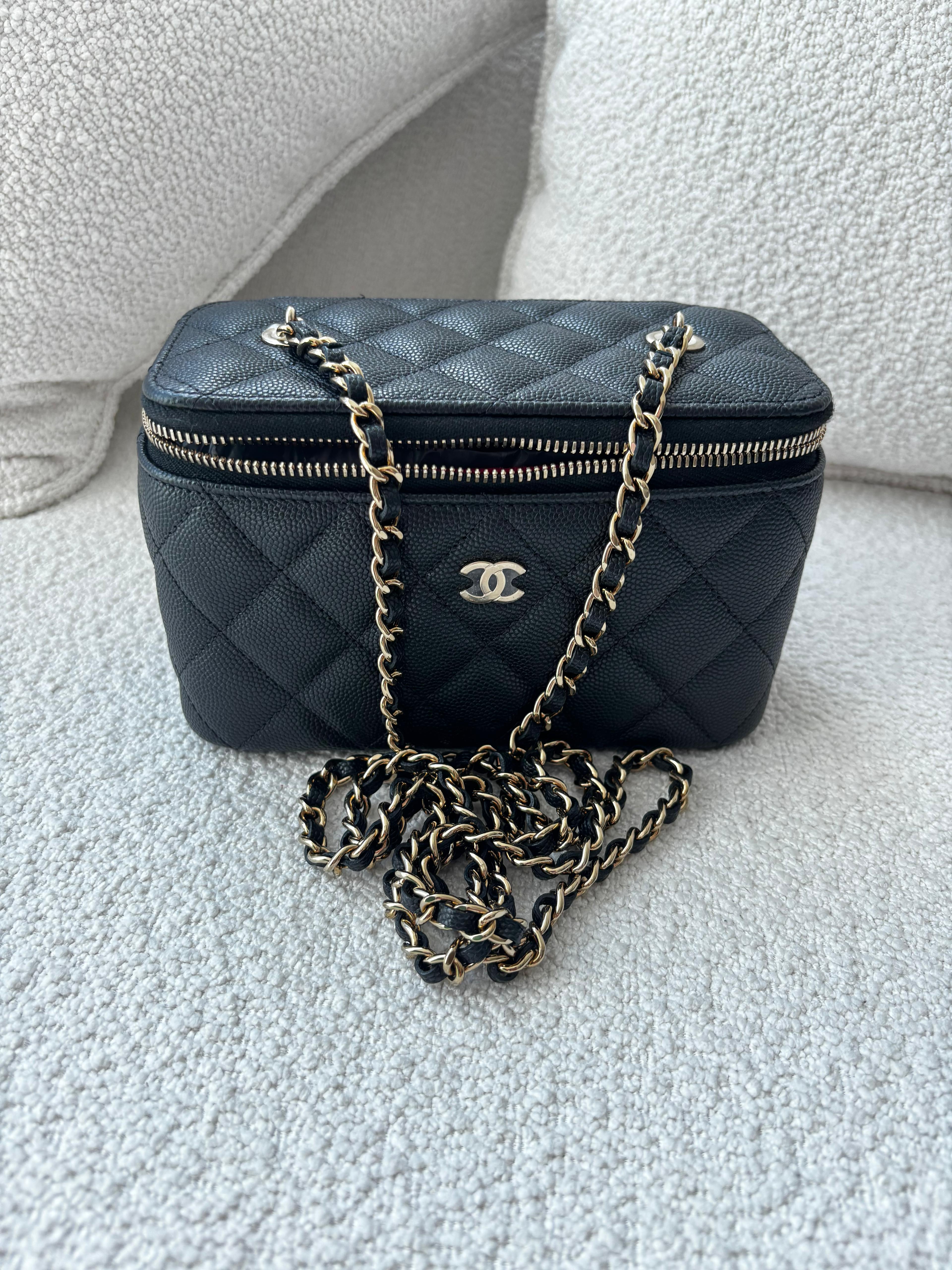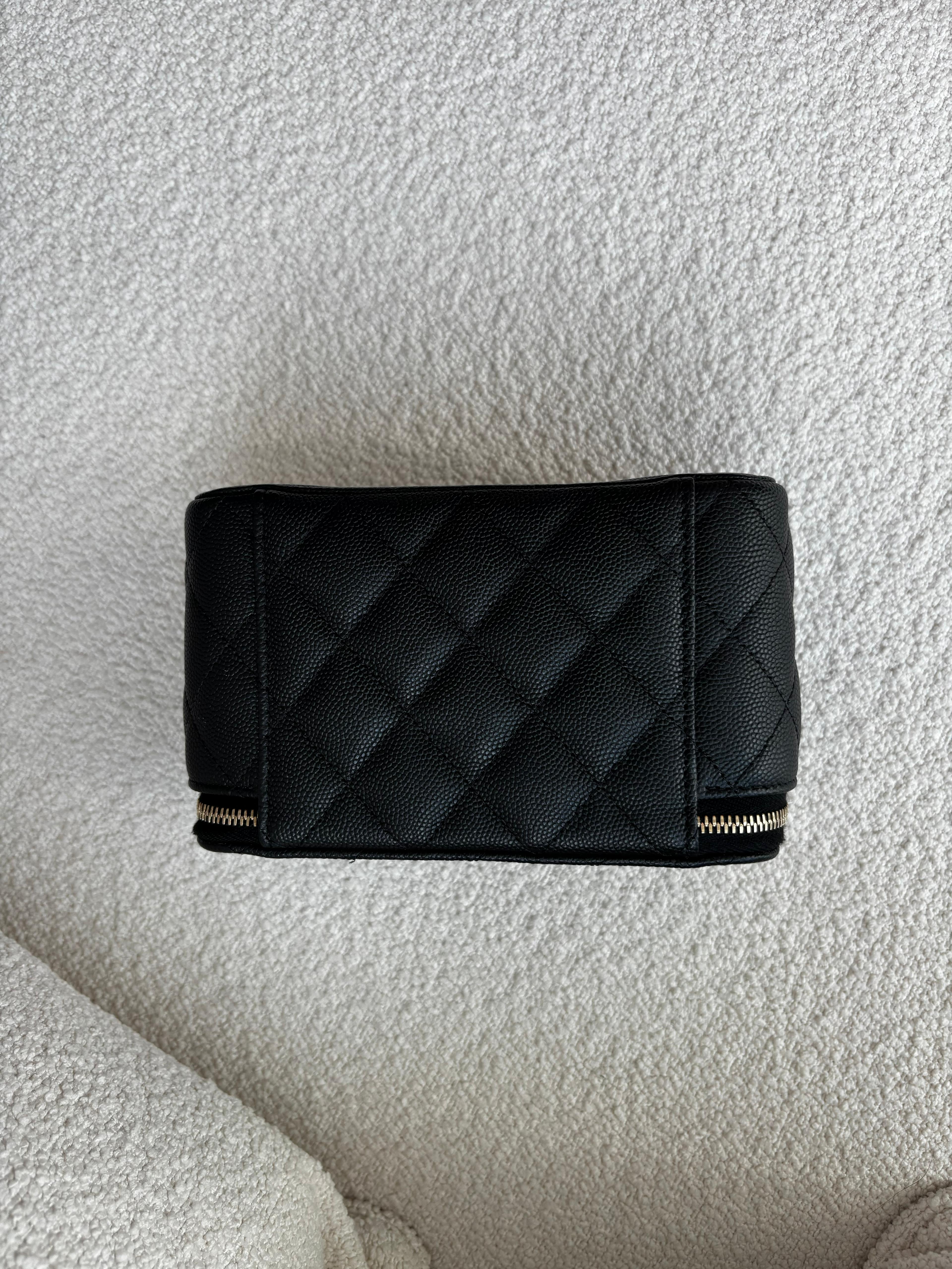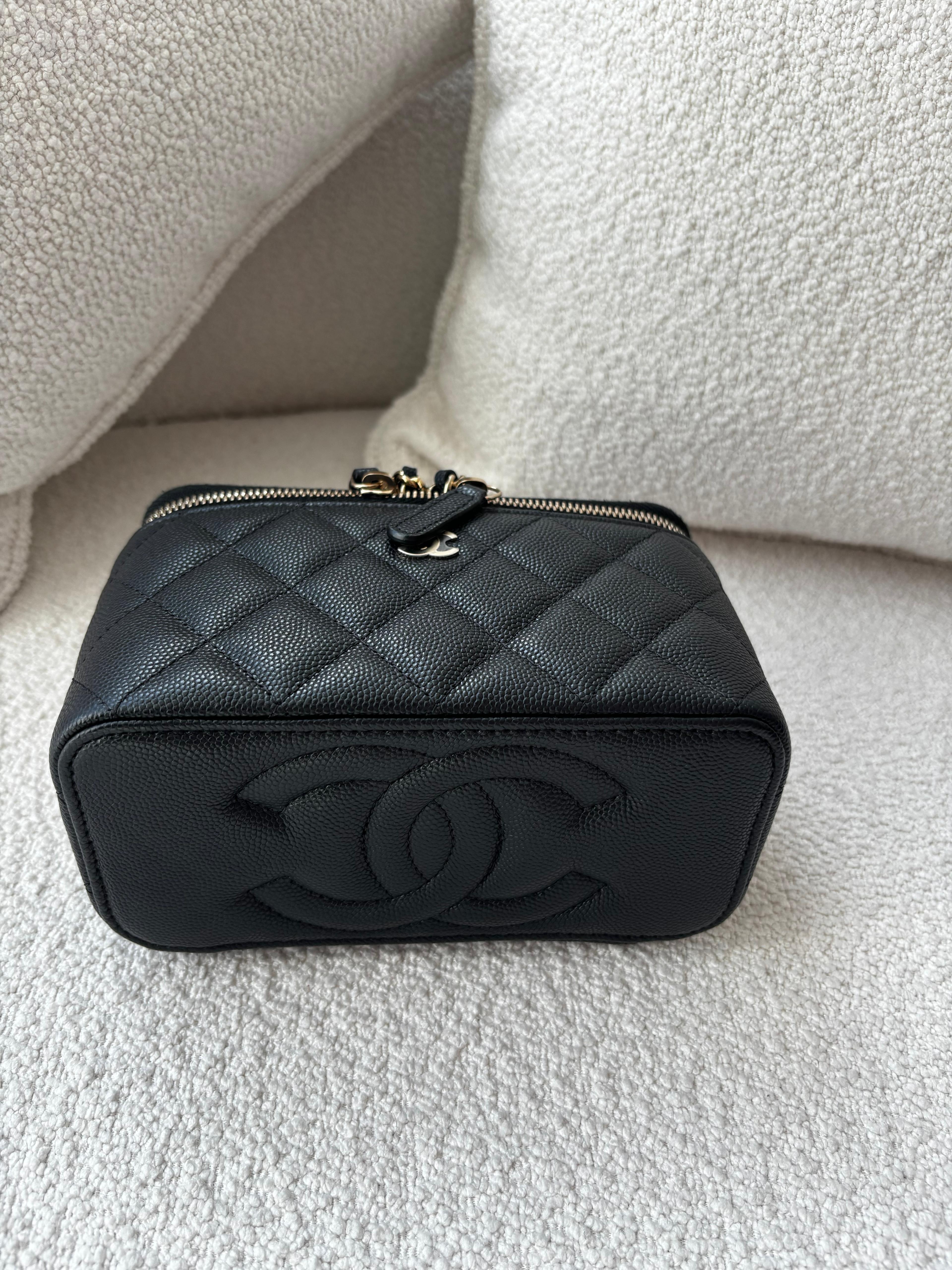 Chanel 22C Black Caviar Vanity with Chain and Gold Hardware, 2023 Condition: Like New Size: 16cm x 9.5cm x 8cm Accessories: Full set included, with a free bag organizer