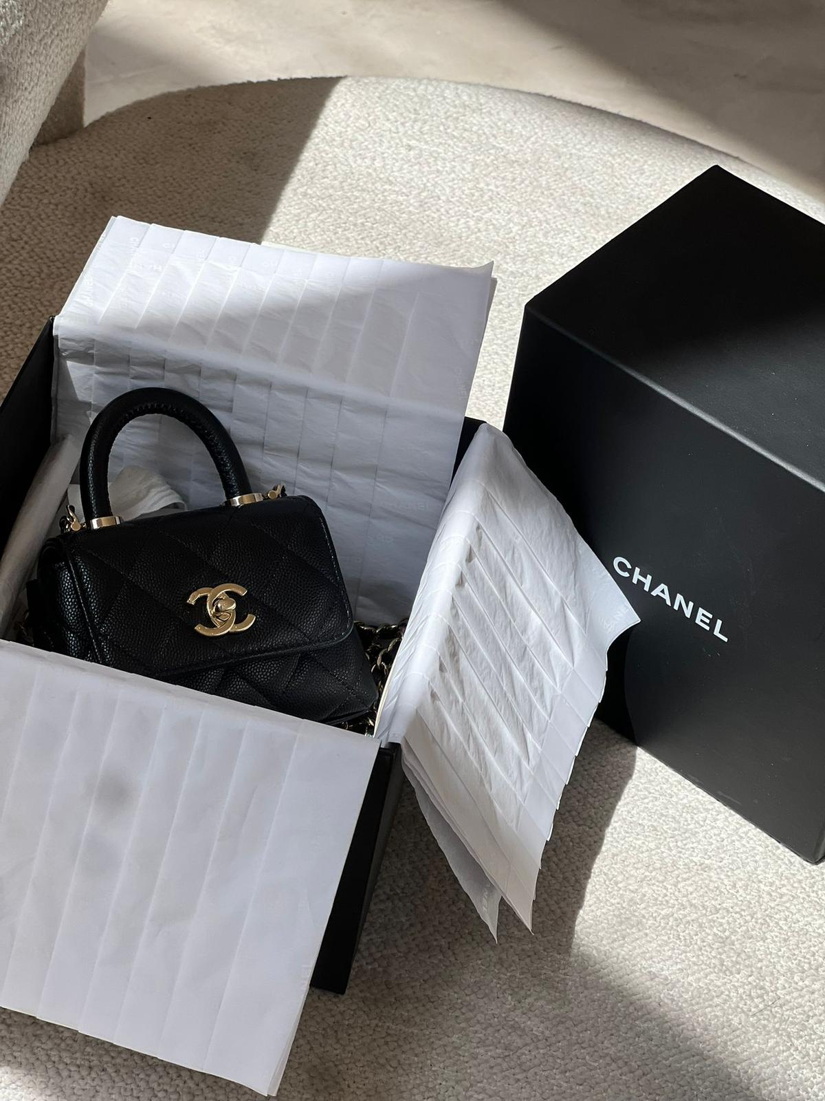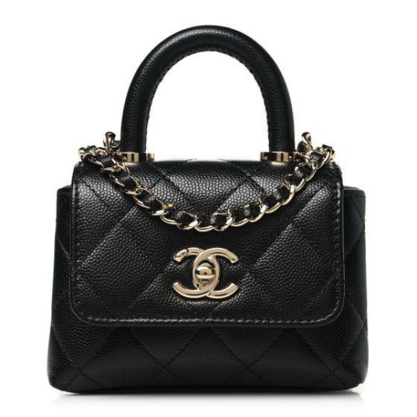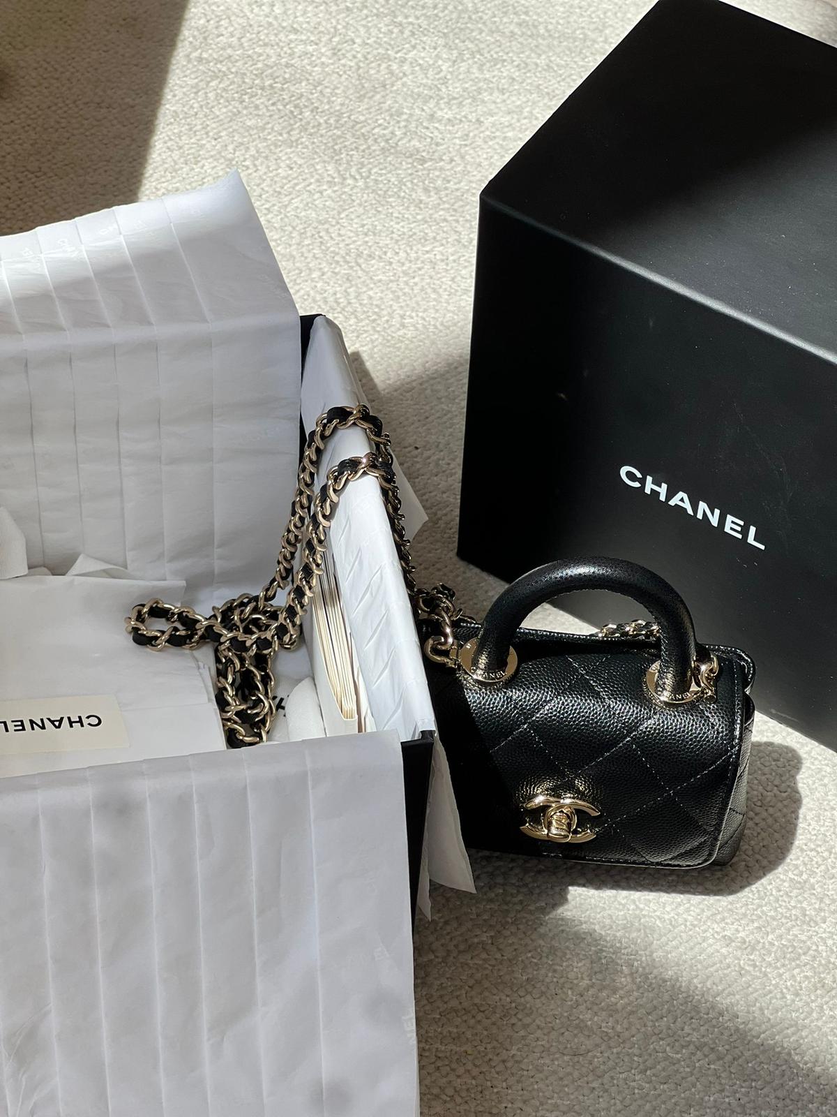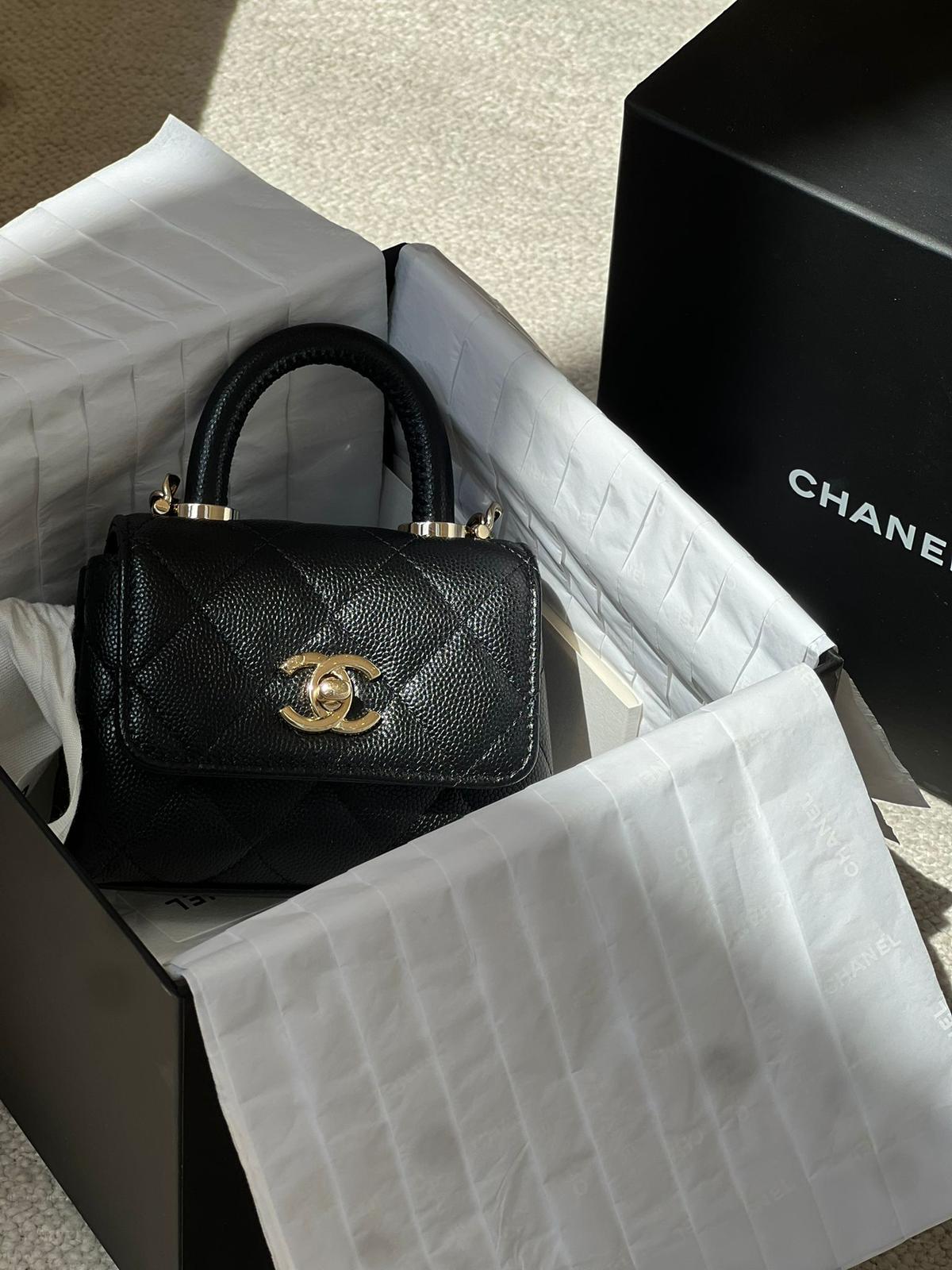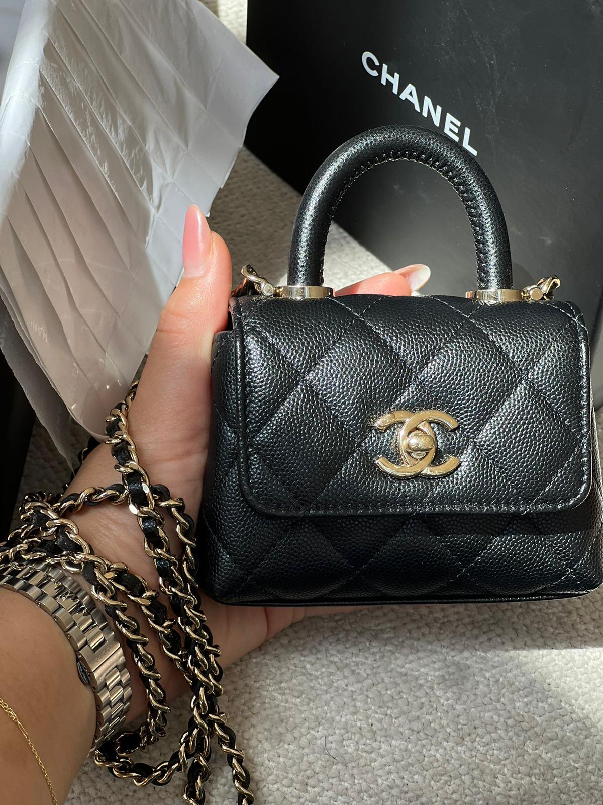 Chanel Black Quilted Caviar Leather Nano Coco Handle Chain Clutch Condition: New Accessories: Complete except for the invoice Buying Price: 22,000
