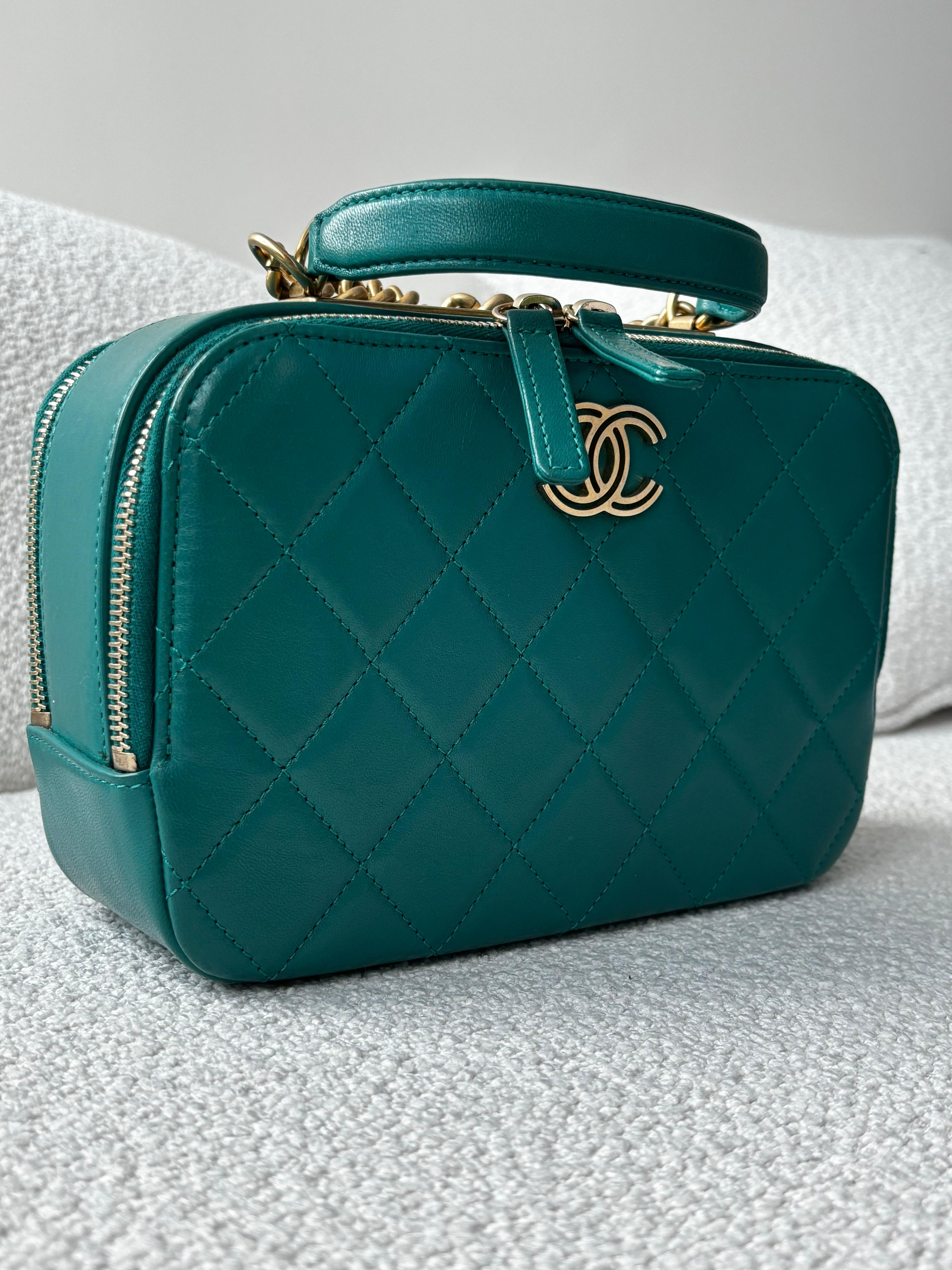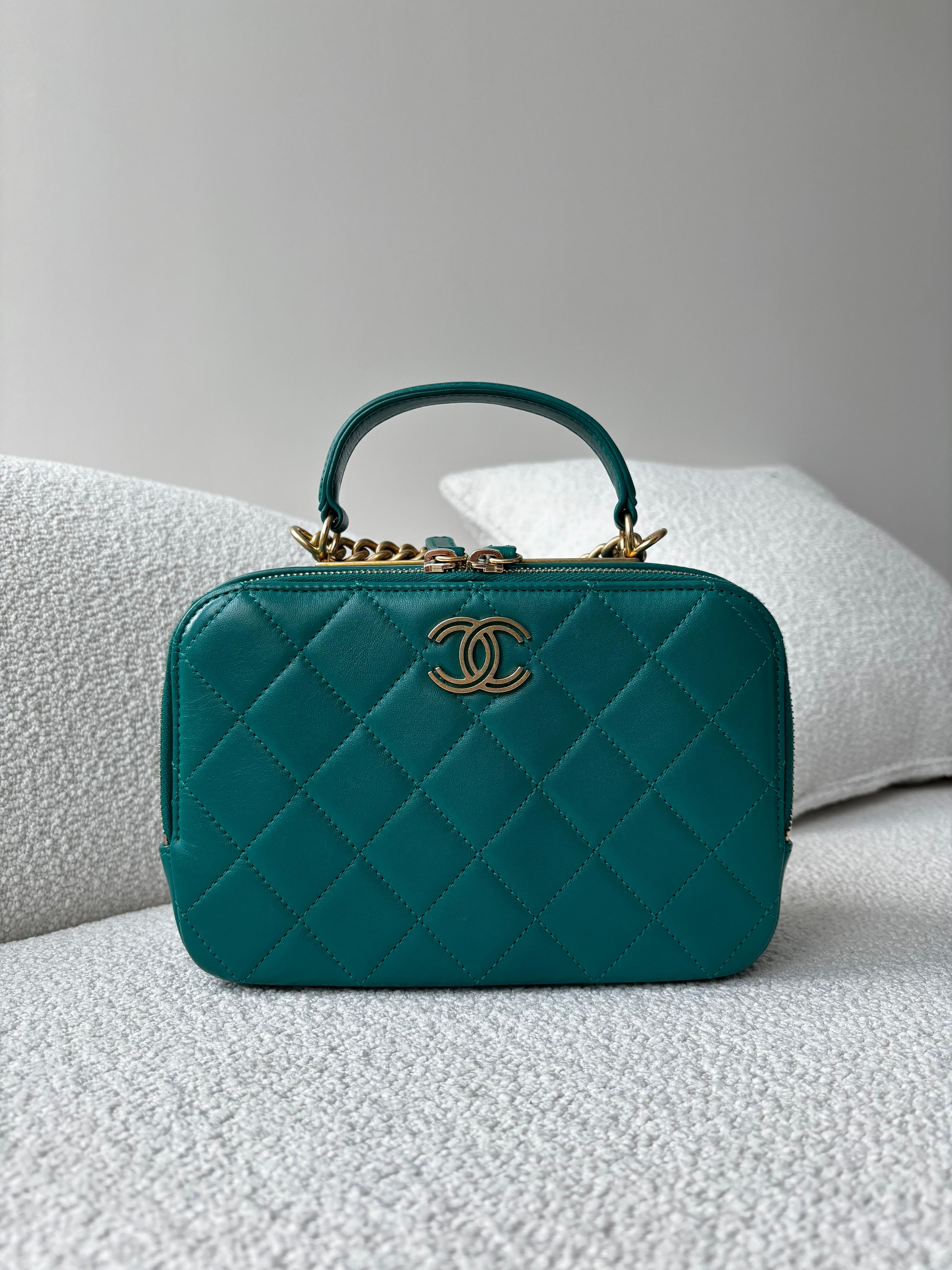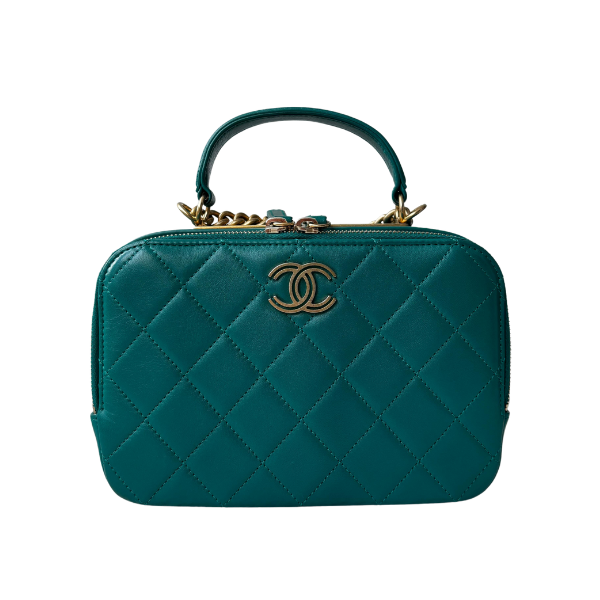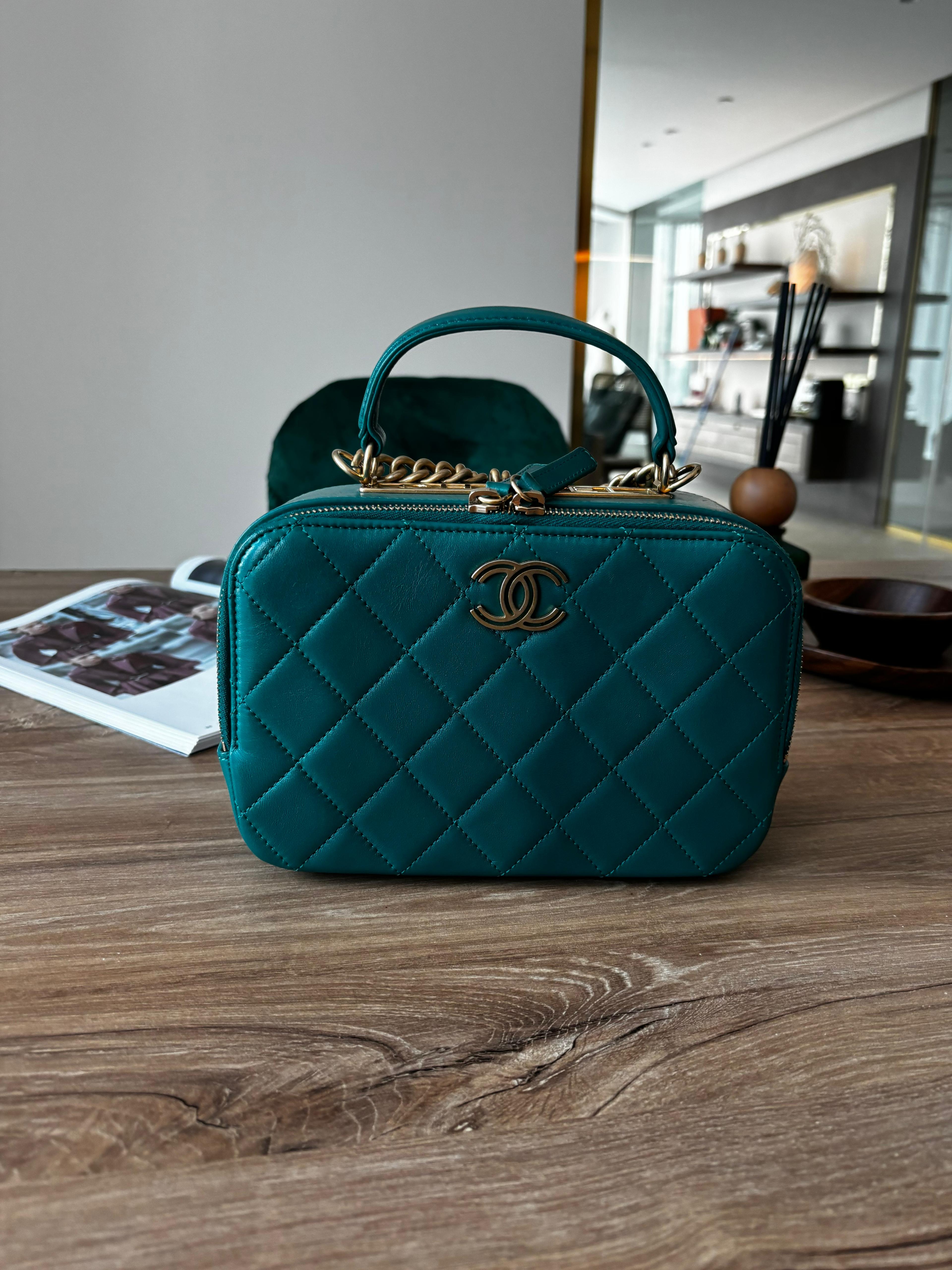 Chanel Trendy Spirit Bowling Bag Made of lambskin with two zipped pockets In rare aquamarine color with gold hardware, 2019 edition Size: 21 × 14 × 8 cm Accessories: Full set, without the paper bag