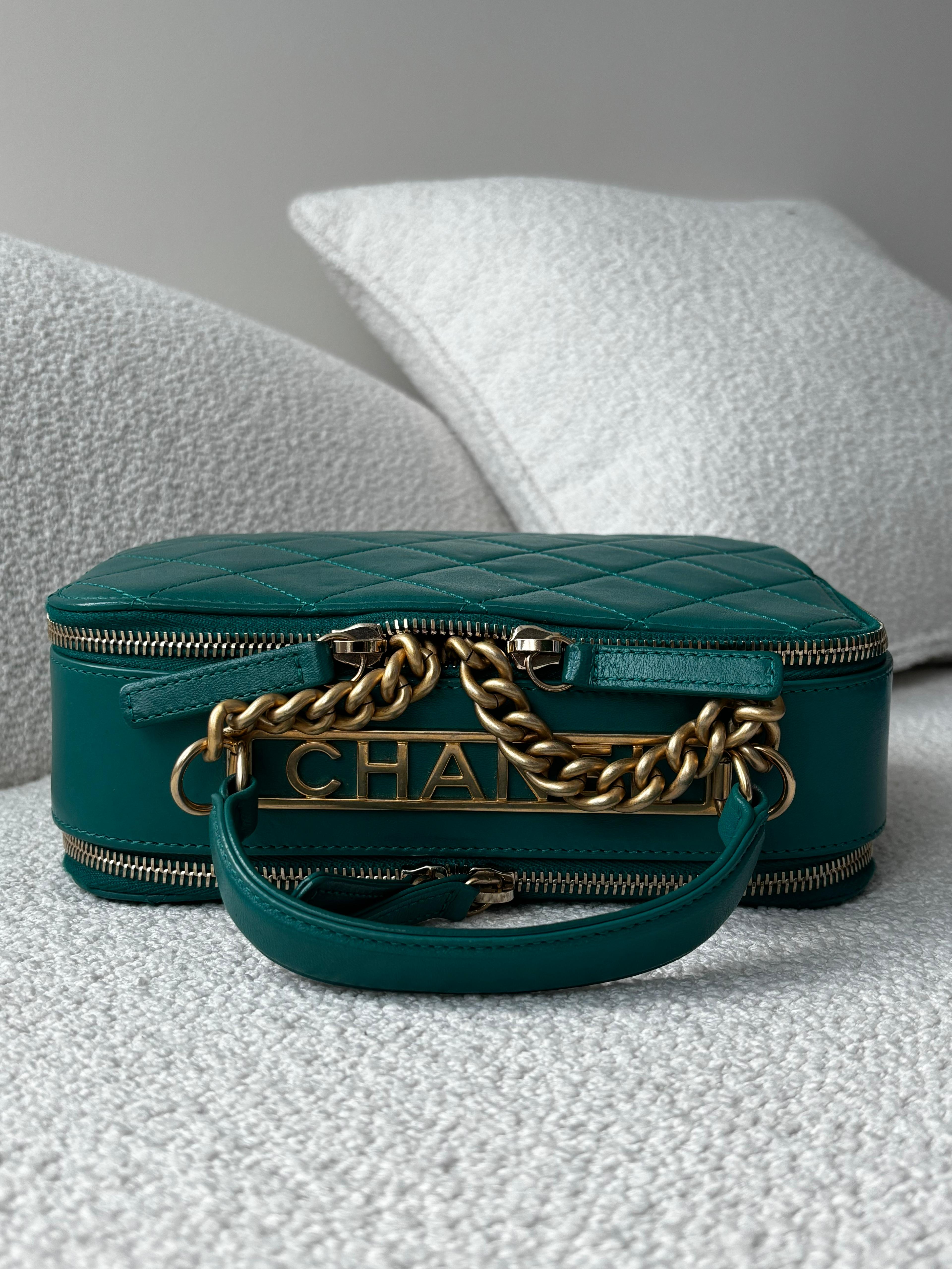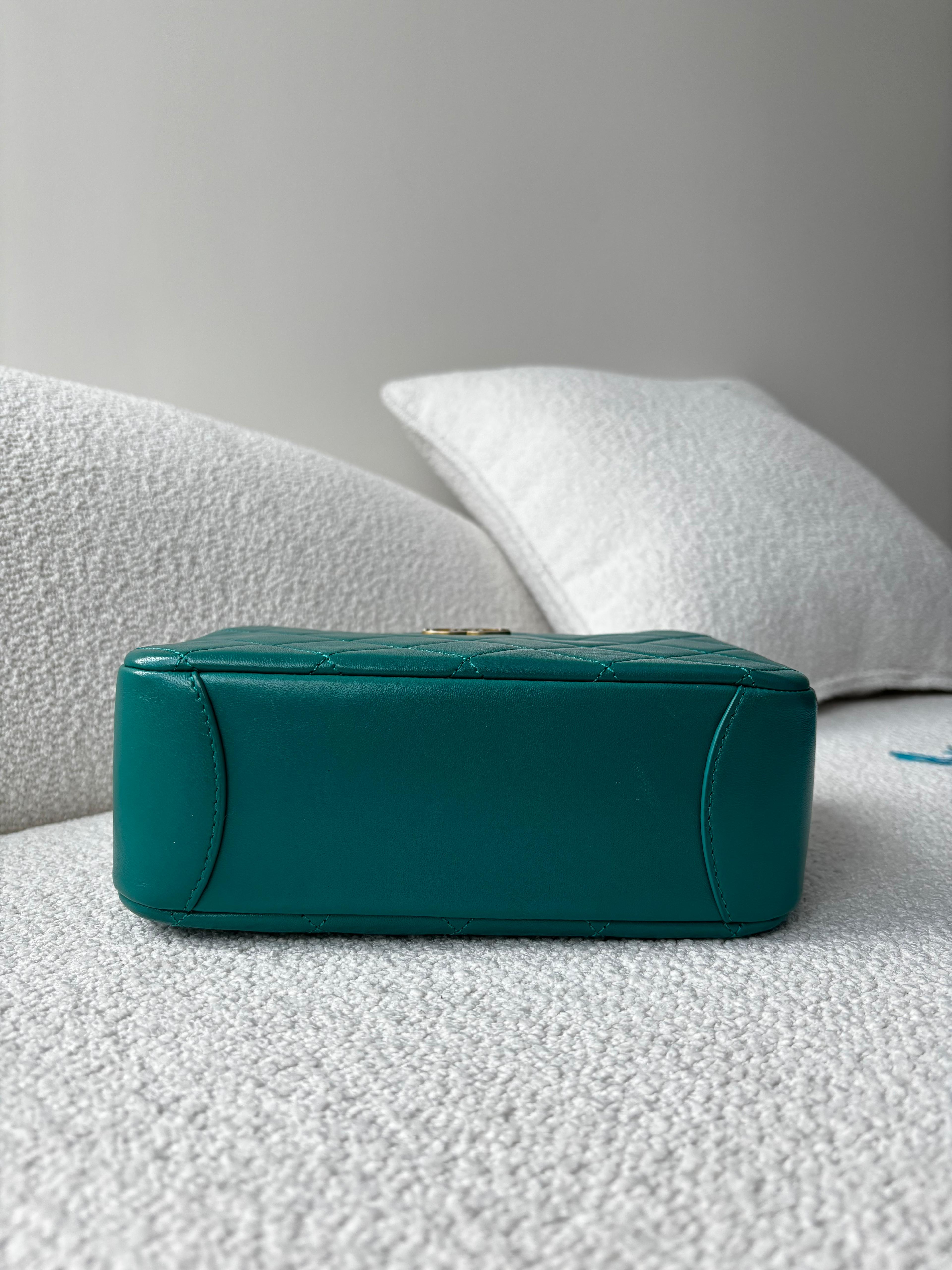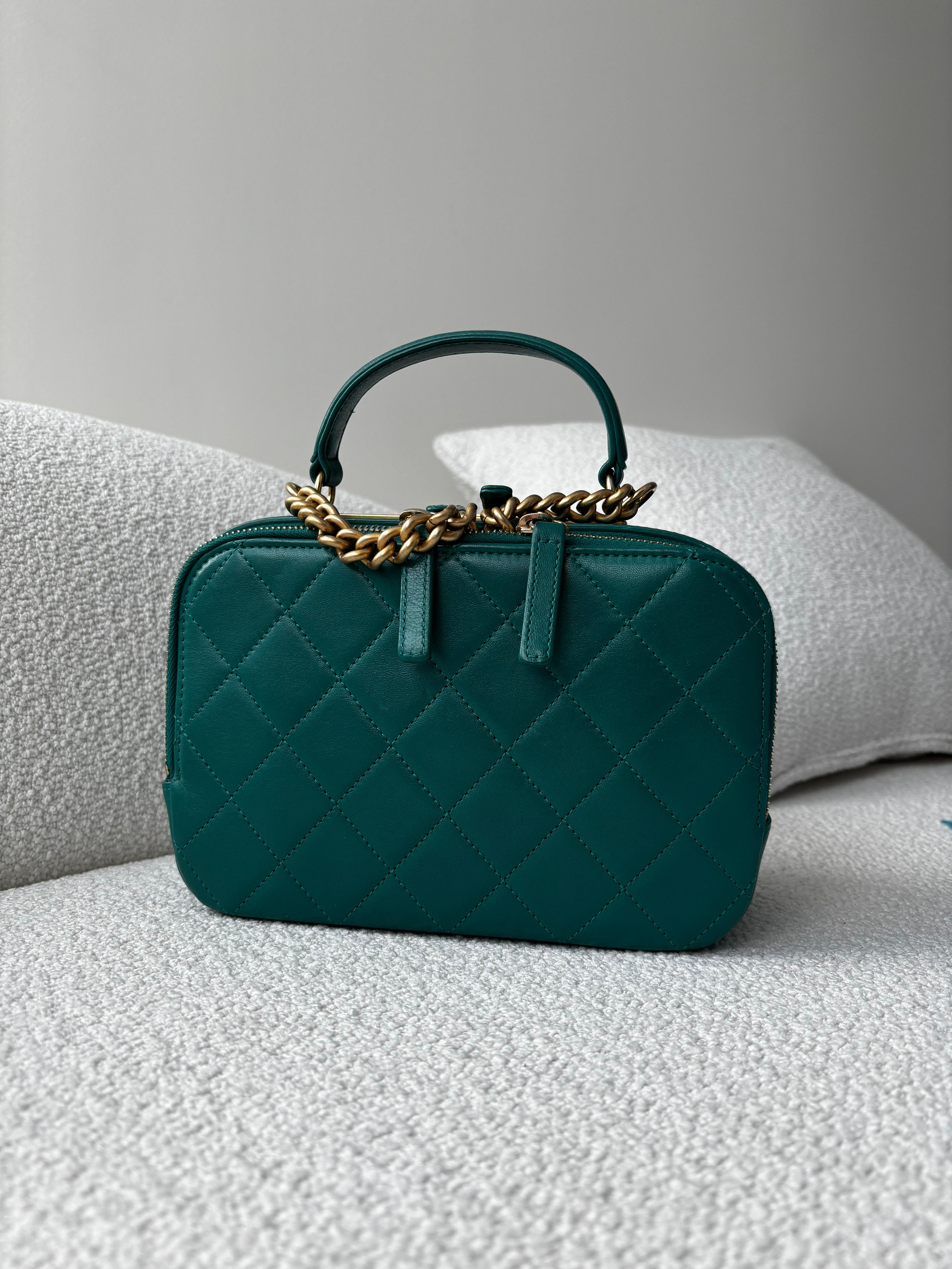 Chanel Trendy Spirit Bowling Bag Made of lambskin with two zipped pockets In rare aquamarine color with gold hardware, 2019 edition Size: 21 × 14 × 8 cm Accessories: Full set, without the paper bag