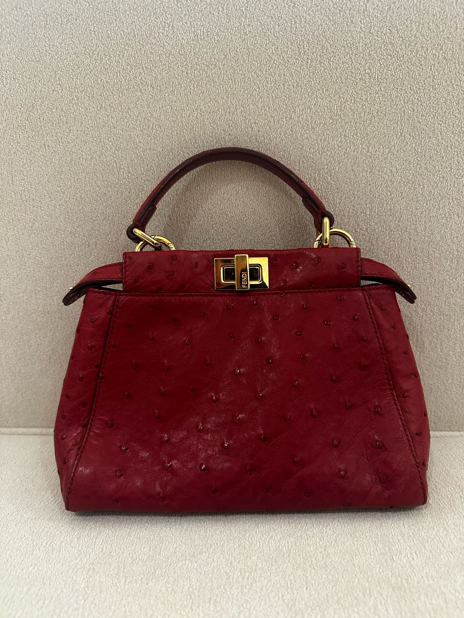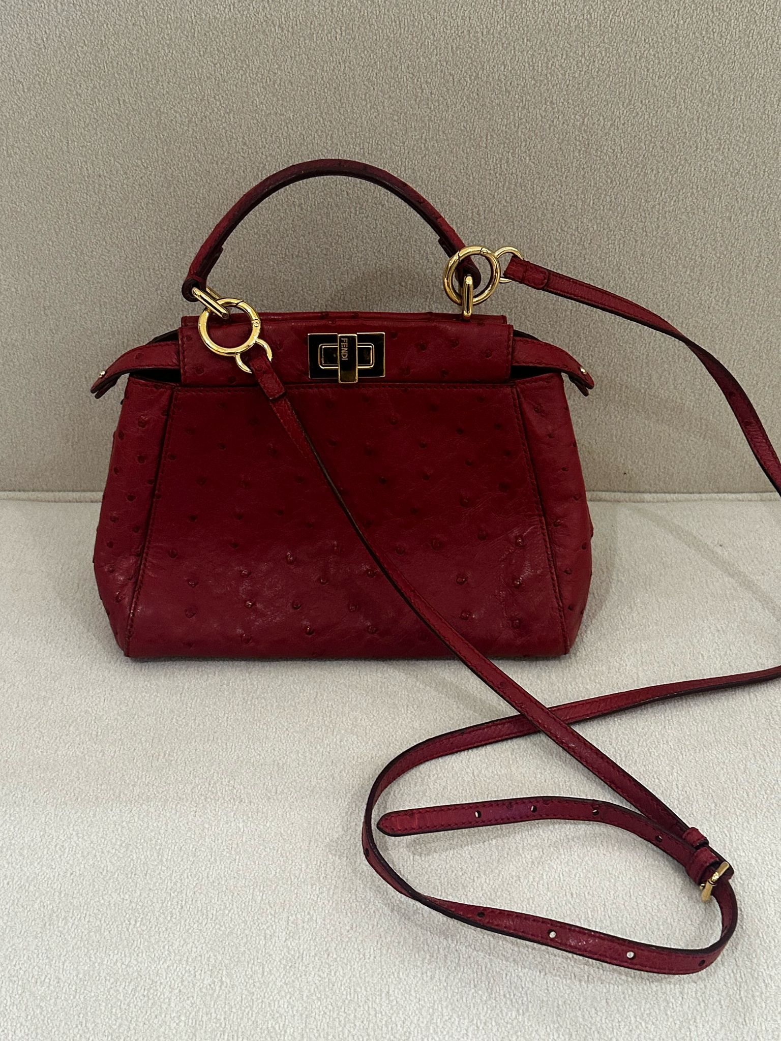 Model Name: Fendi Red Ostrich Pekaboo Size: Pre-owned Purchase Price: 30,000 Selling Price: 15,000