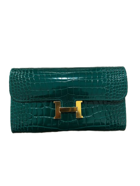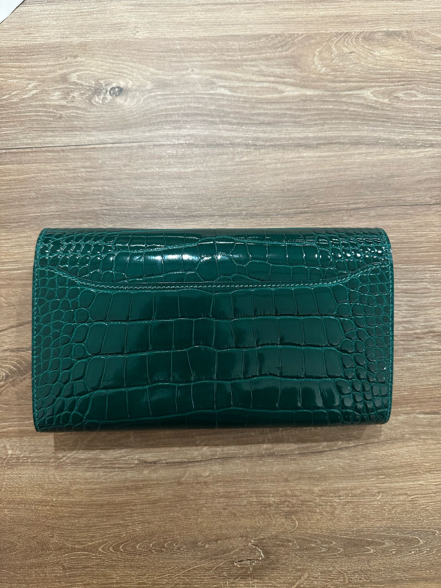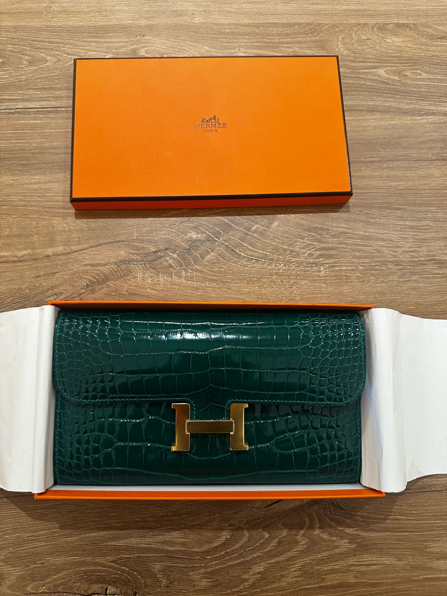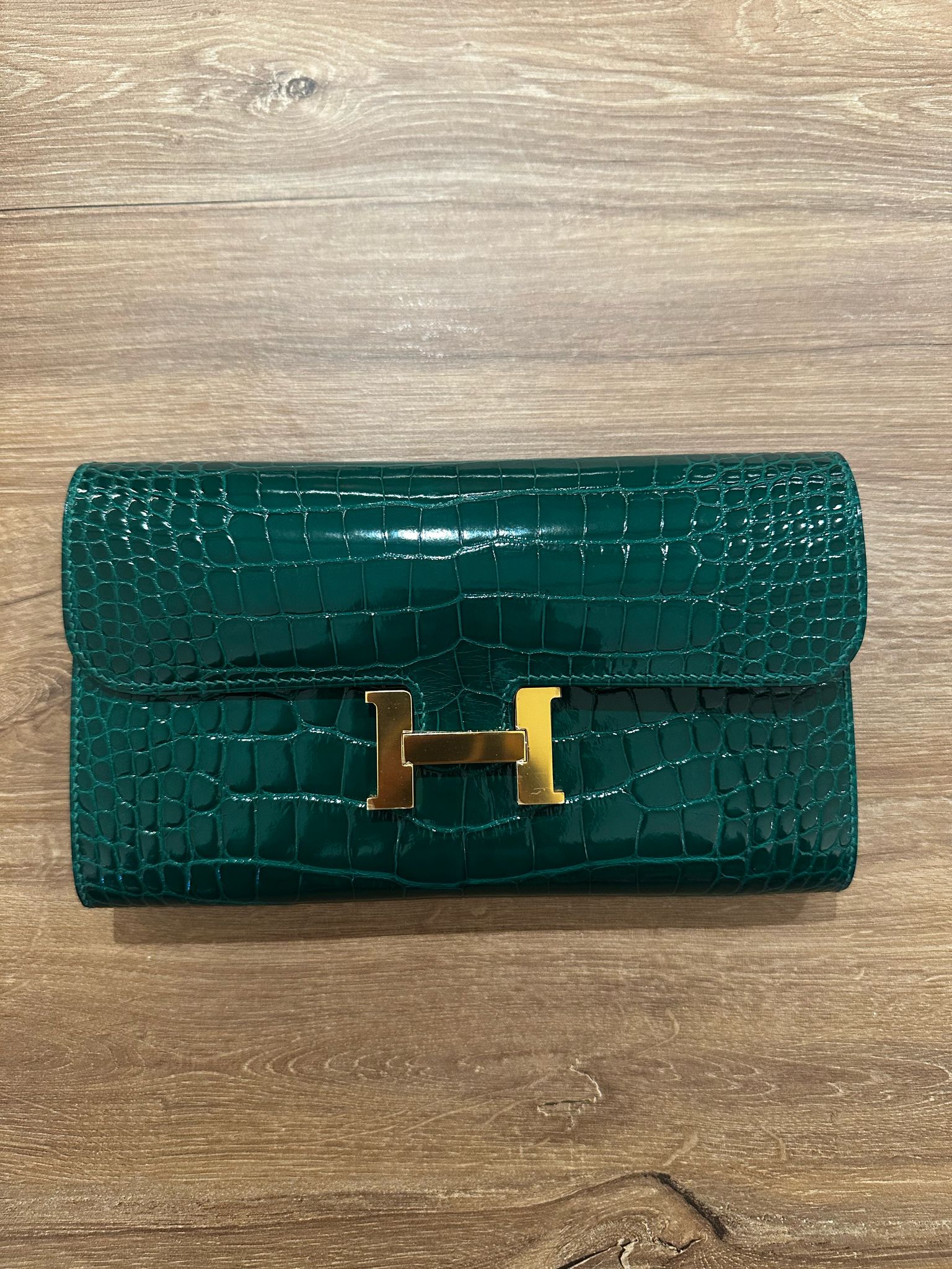 Hermès Emerald Green Shiny Alligator Crocodile Constance Long Wallet Clutch Bag Brand New Price: 60,000 QAR (below boutique price) Batra offers authenticity verification and international shipping services. Please contact us before purchasing to ensure a safe transaction.
