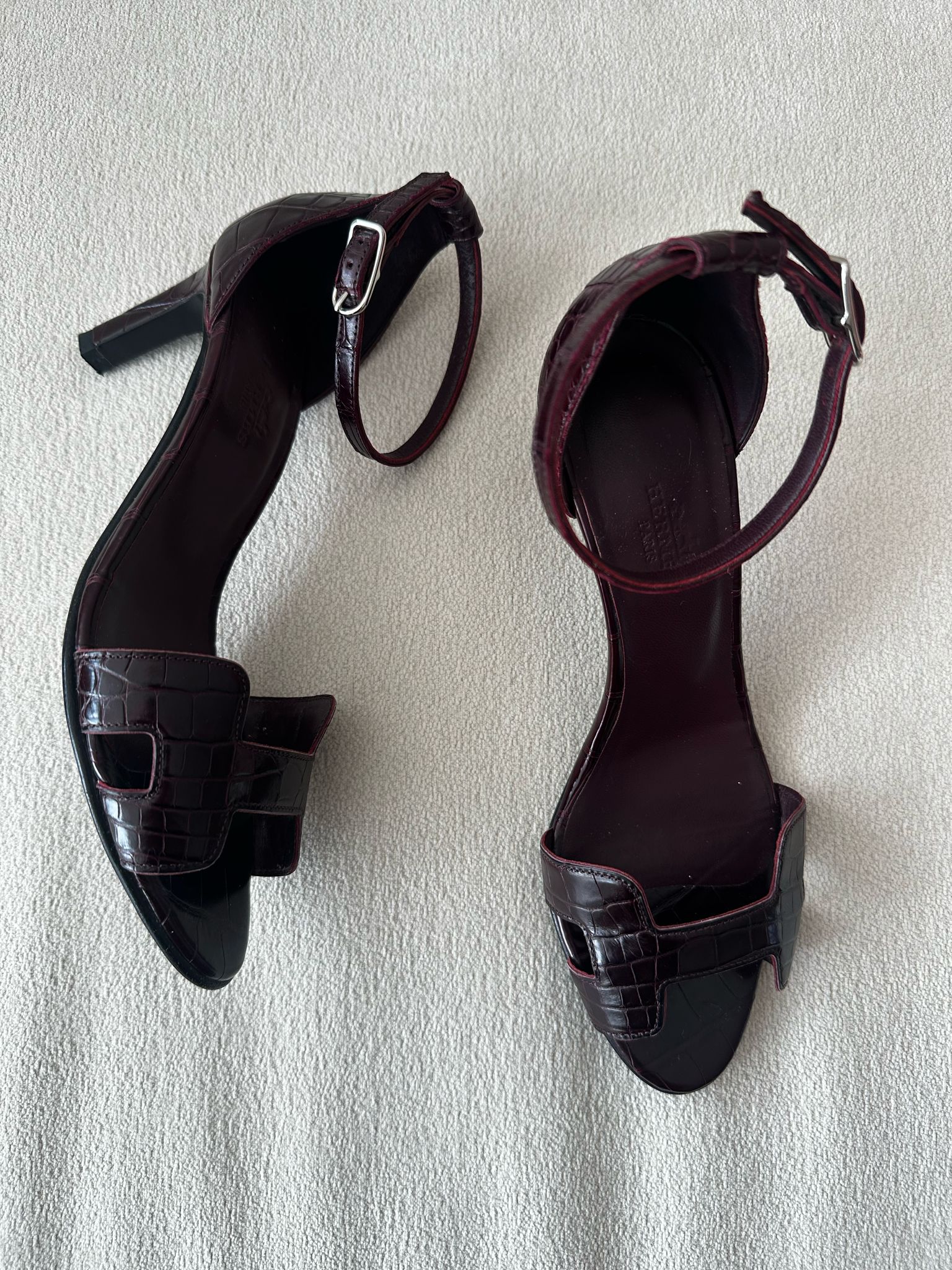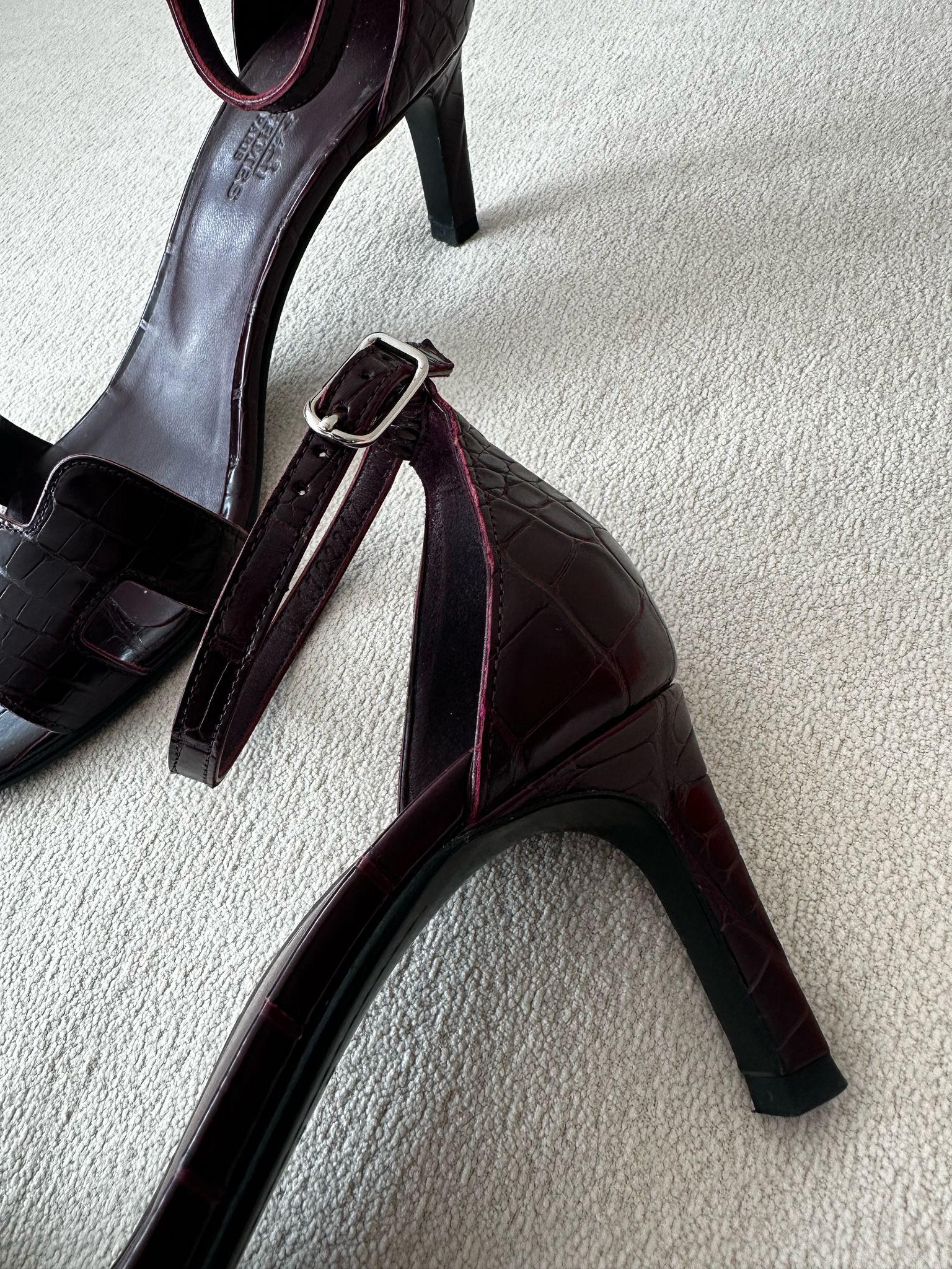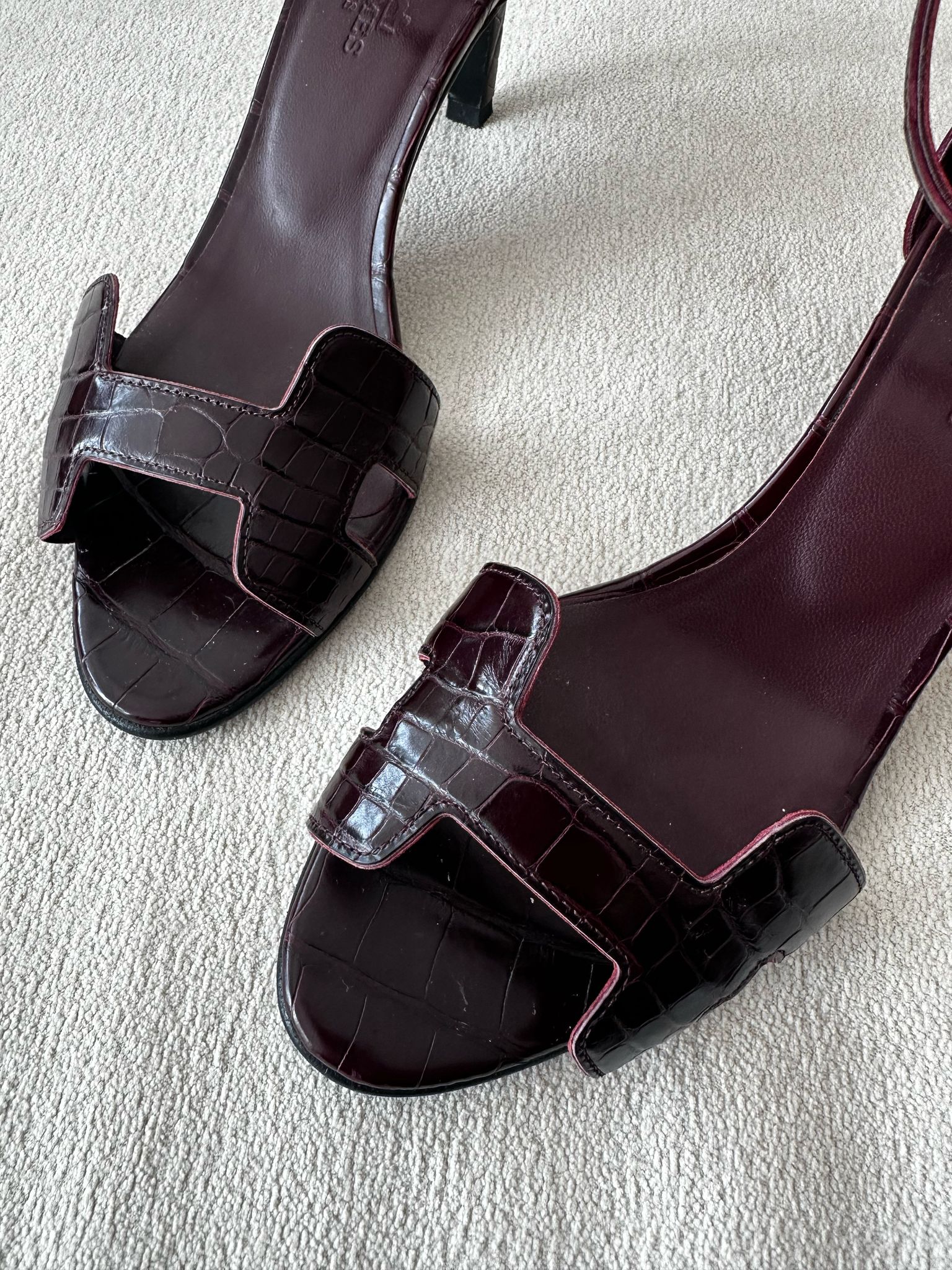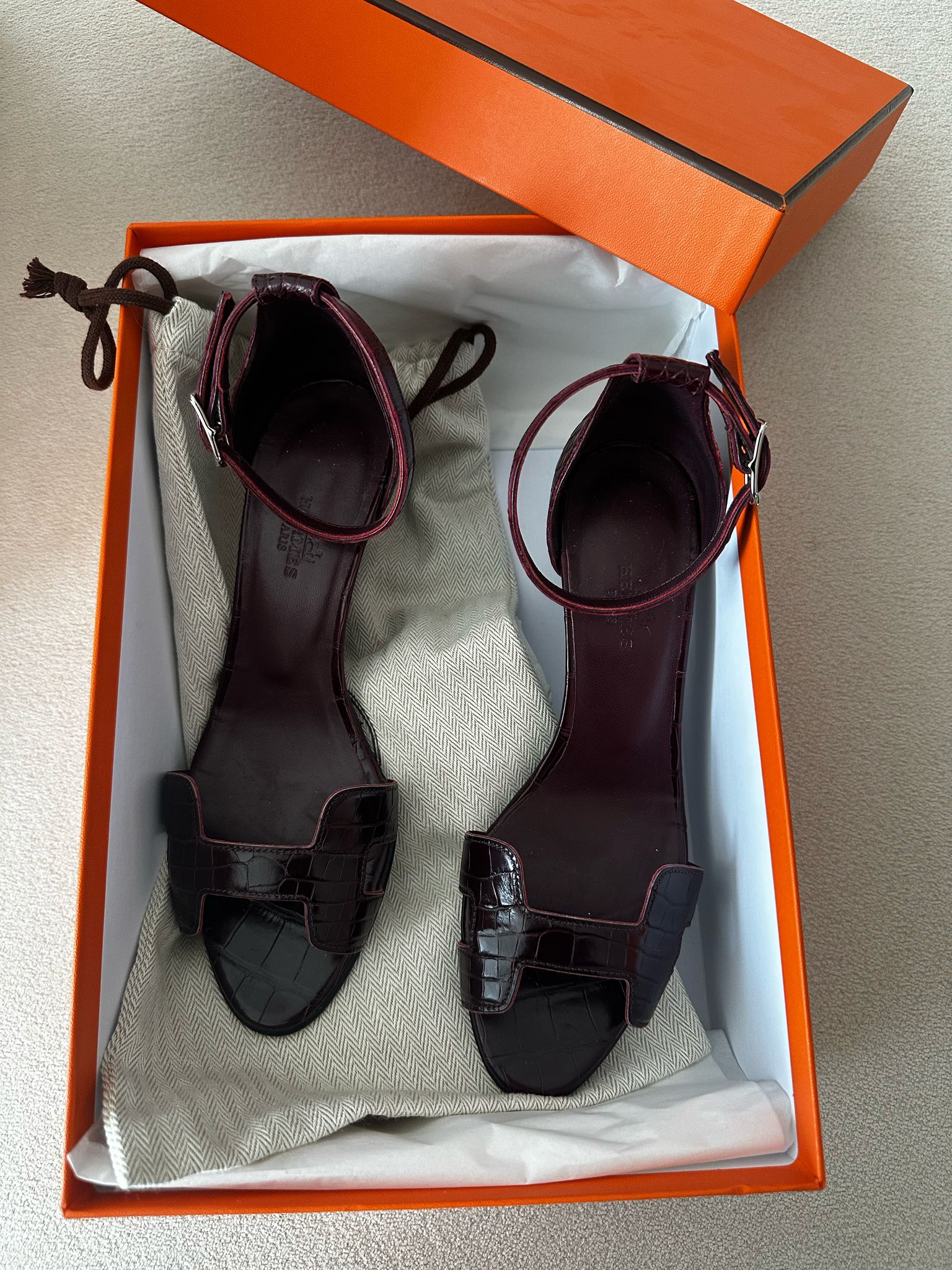 Hermès Premiere Alligator Sandal – Burgundy, Alligator Leather Size: 35 Condition: Worn twice – excellent condition Original Price: 29,000 QAR Selling Price: 10,000 QAR Accessories: Dust bag, box, full set, and a copy of the invoice