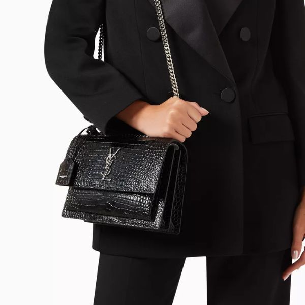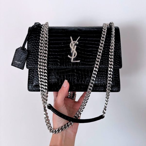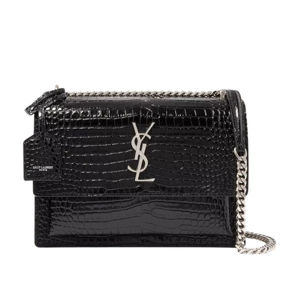 Brand: Saint Laurent Model: Medium Sunset Bag Material: Crocodile Embossed Shiny Leather Size: Medium Condition: Excellent Selling Price: 5,000 QAR Contact: +974 3356 7965
