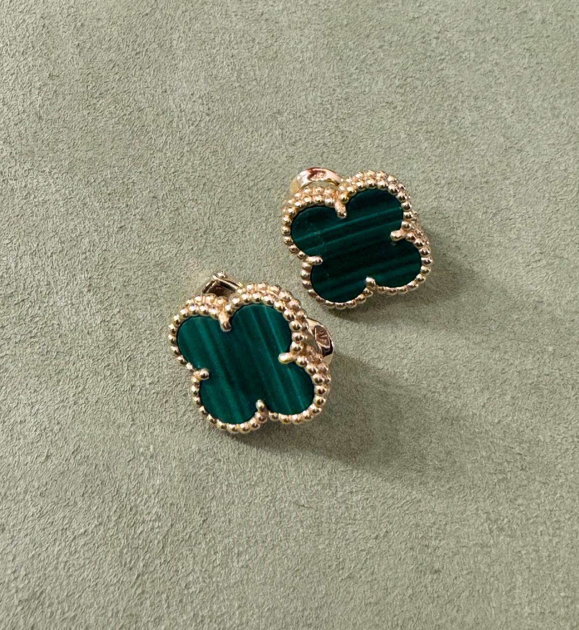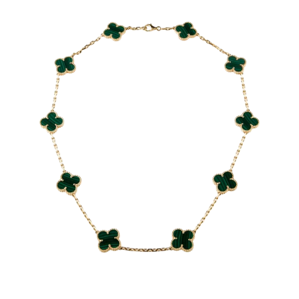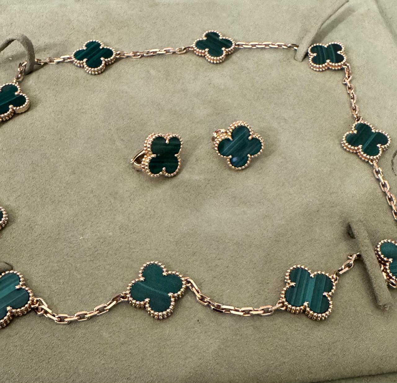 Van Cleef & Arpels Malachite 10 Motif Necklace with Malachite Earrings Condition: Excellent Includes: Necklace, Earrings, Box, Invoice Batra provides authenticity verification and international shipping. Please contact us before purchasing to ensure a secure transaction.